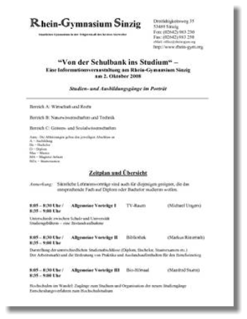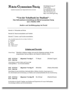 “Von der Schulbank ins Studium“29. September 2008Eine Informationsveranstaltung am Rhein-Gymnasium Sinzig am2. Oktober 2008 Studien- und Ausbildungsgänge im Porträt Bereich A: Wirtschaft und Recht Bereich B: Naturwissenschaften und Technik Bereich C: Geistes- und Sozialwissenschaften