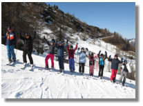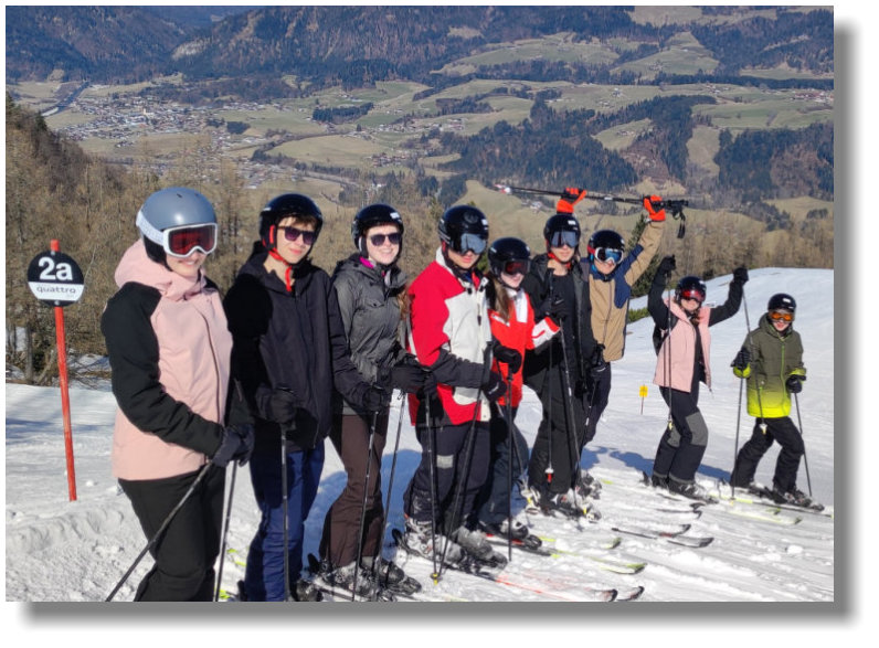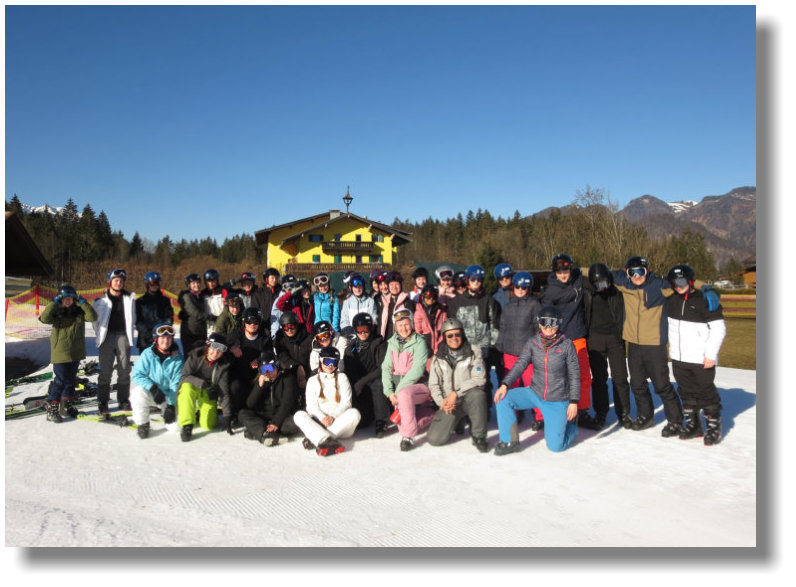 Schüler, die mit ihren (Ski-) Lehrern Marc Steuer, Lena Eichhofer,